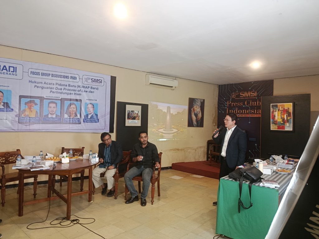 Untuk mencapai sasaran menganalisis pasal-pasal KUHAP, FGD yang diselenggarakan PERADI Dewan Pimpinan Cabang Tangerang bekerja sama dengan SMSI Pusat mengangkat tema “Penguatan Due Process of Law dan Perlindungan HAM”.