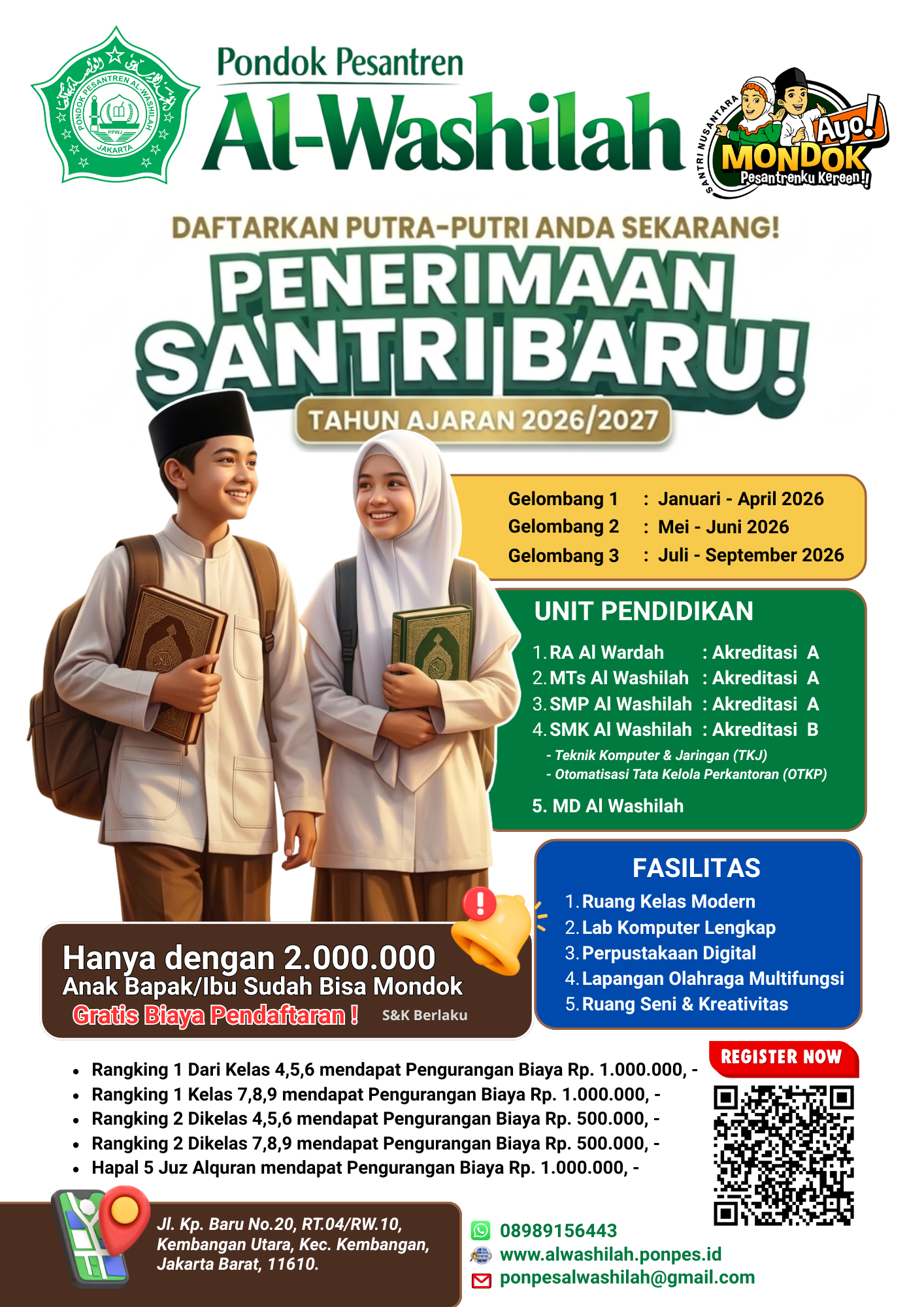 Pondok Pesantren Al Washilah Jakarta kembali membuka pendaftaran santri baru untuk Tahun Ajaran 2026/2027. Terletak di jantung ibu kota, Al Washilah menjadi salah satu most wanted pesantren Jakarta, pilihan banyak orang tua yang ingin anak mereka mendapatkan pendidikan agama yang kuat sekaligus pembelajaran akademik modern.